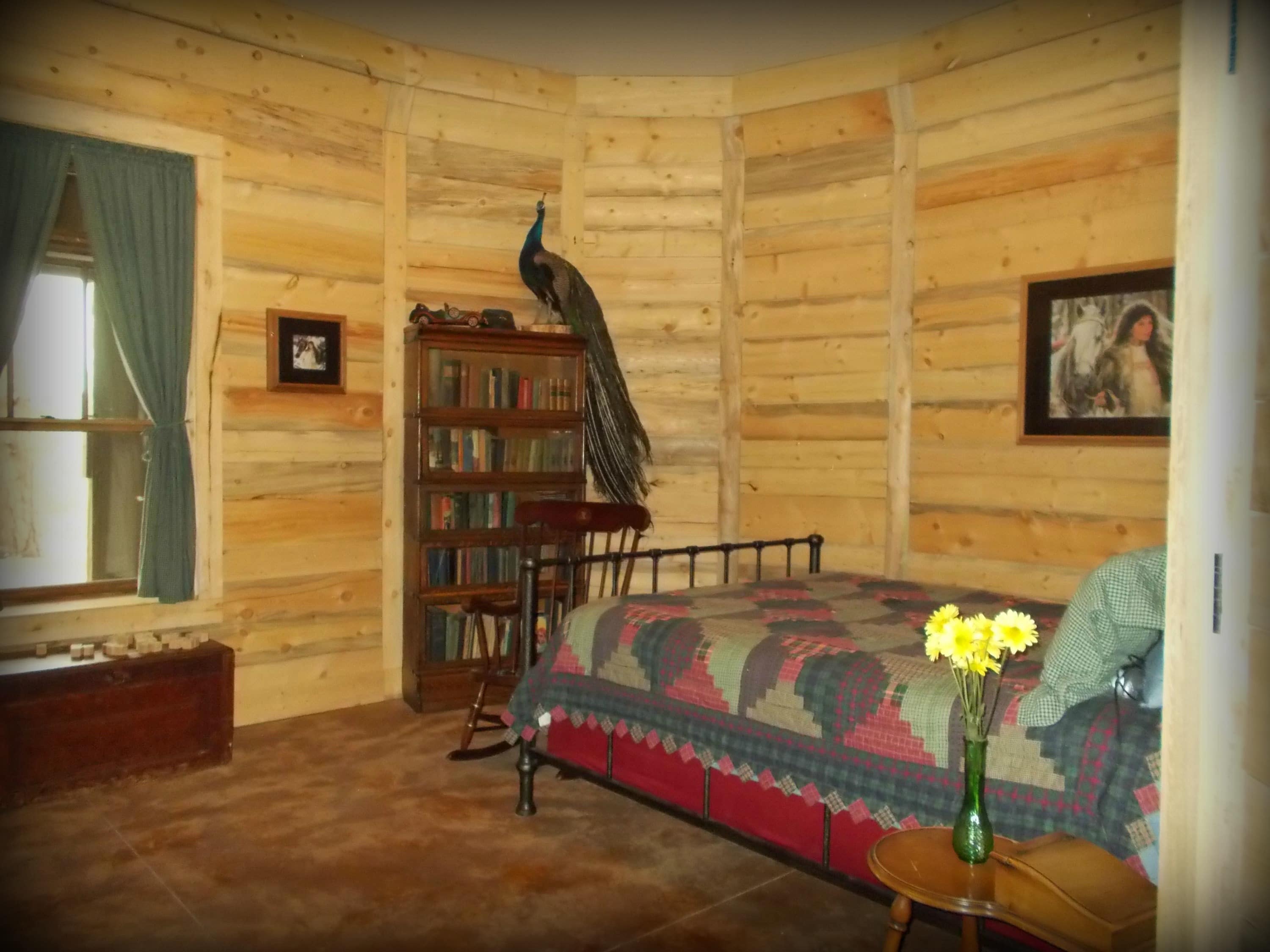 To top it off, there is an “out house” – an inside bathroom right next door with a full-tiled shower to enjoy. While you’re here, see if you can find “Pete” the peacock who watches over this room for us.